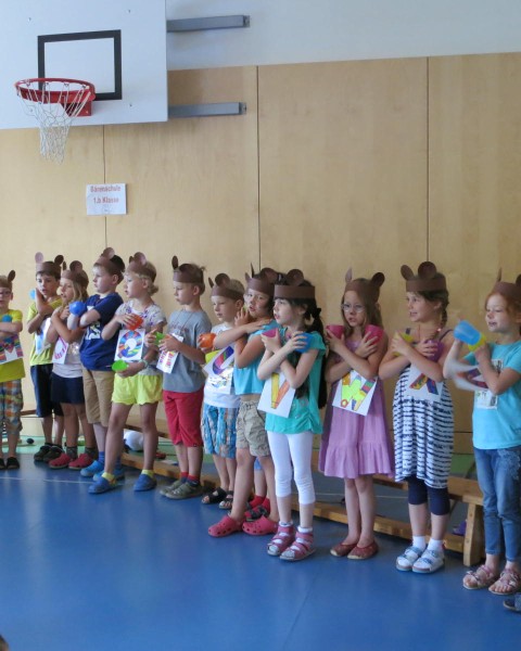 26 ABC- Bären aus der 1.b Klasse zeigten, bei der Aufführung des Bären ABC´s am 12.6., ihr Können.