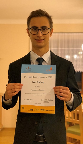 Paul Regitnig aus der vorjährigen 8b-Klasse erhielt für seine ausgezeichnete vorwissenschaftliche Arbeit zum Thema "Untersuchung der Reaktionsfähigkeit und sekundärer Phänomene unter Einfluss von Energy-Drinks" den 3. Preis der Hans Riegel-Fachpreise im Fachbereich Biologie. Herzlichste Gratulation! OStR Mag. Johanna Wilplinger zurück